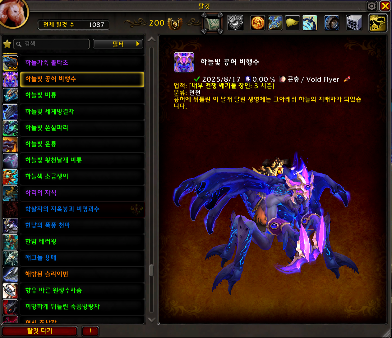 2025.08.17 하늘빛 공허 비행수 획득 1087번째 탈것