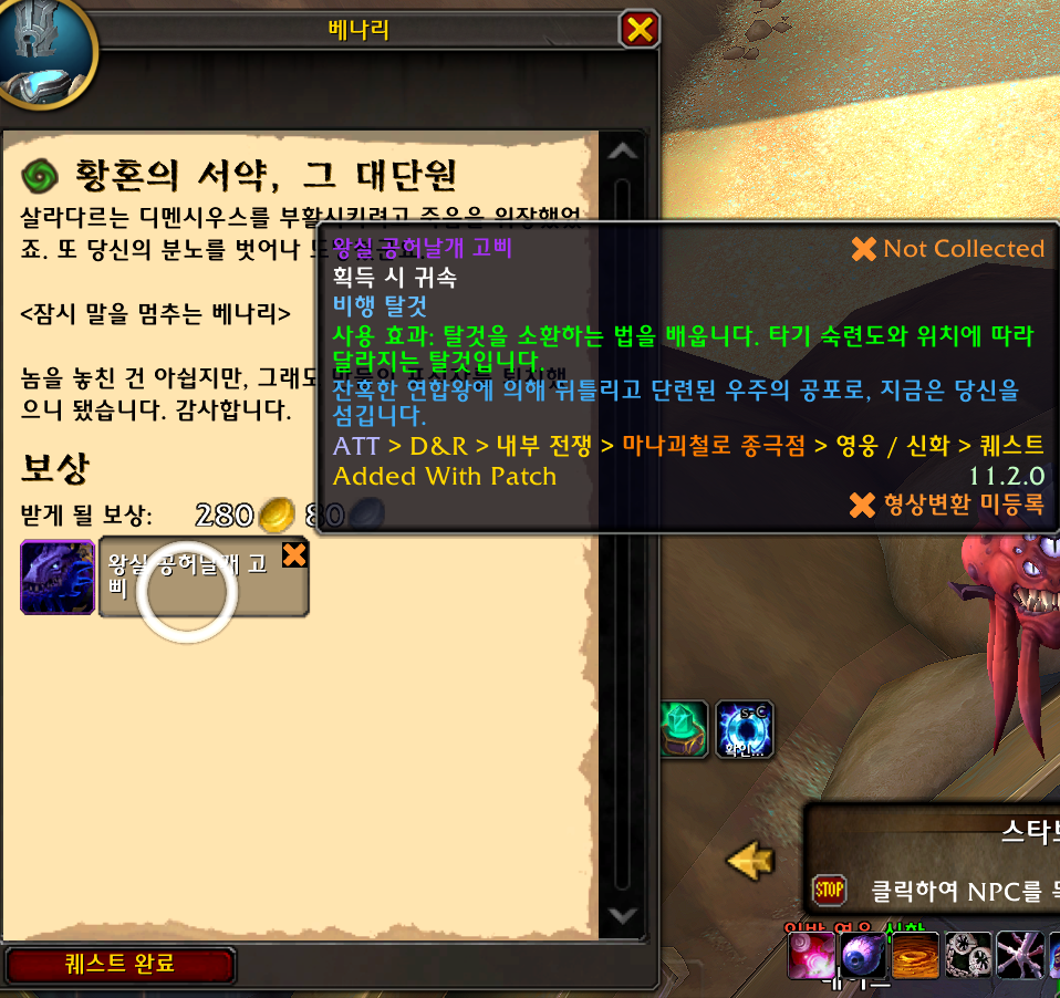 왕실 공허날개 탈것은 내부전쟁 확장팩 탈것으로 정예 디멘시우스 업적보상입니다.