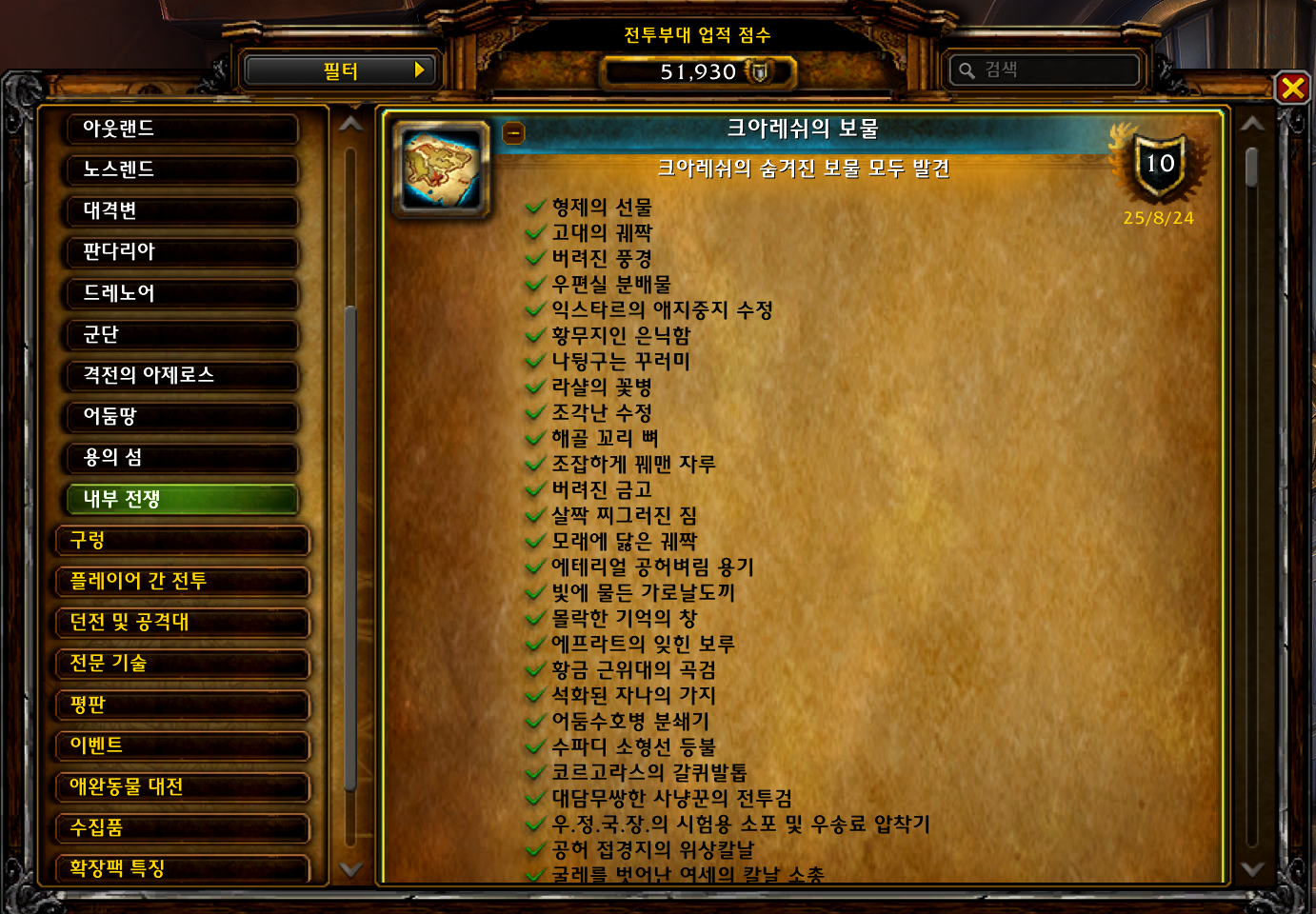 2025.08.24 폴짝 폴짝 뛰어라! 획득 10점짜리 51910점 폴짝 폴짝 뛰어라! 업적은 내부전쟁 확장팩 업적으로 크아레쉬의 보물 업적중에에테리얼 공허벼림 용기를 획득하면 자동으로 획득하는 업적입