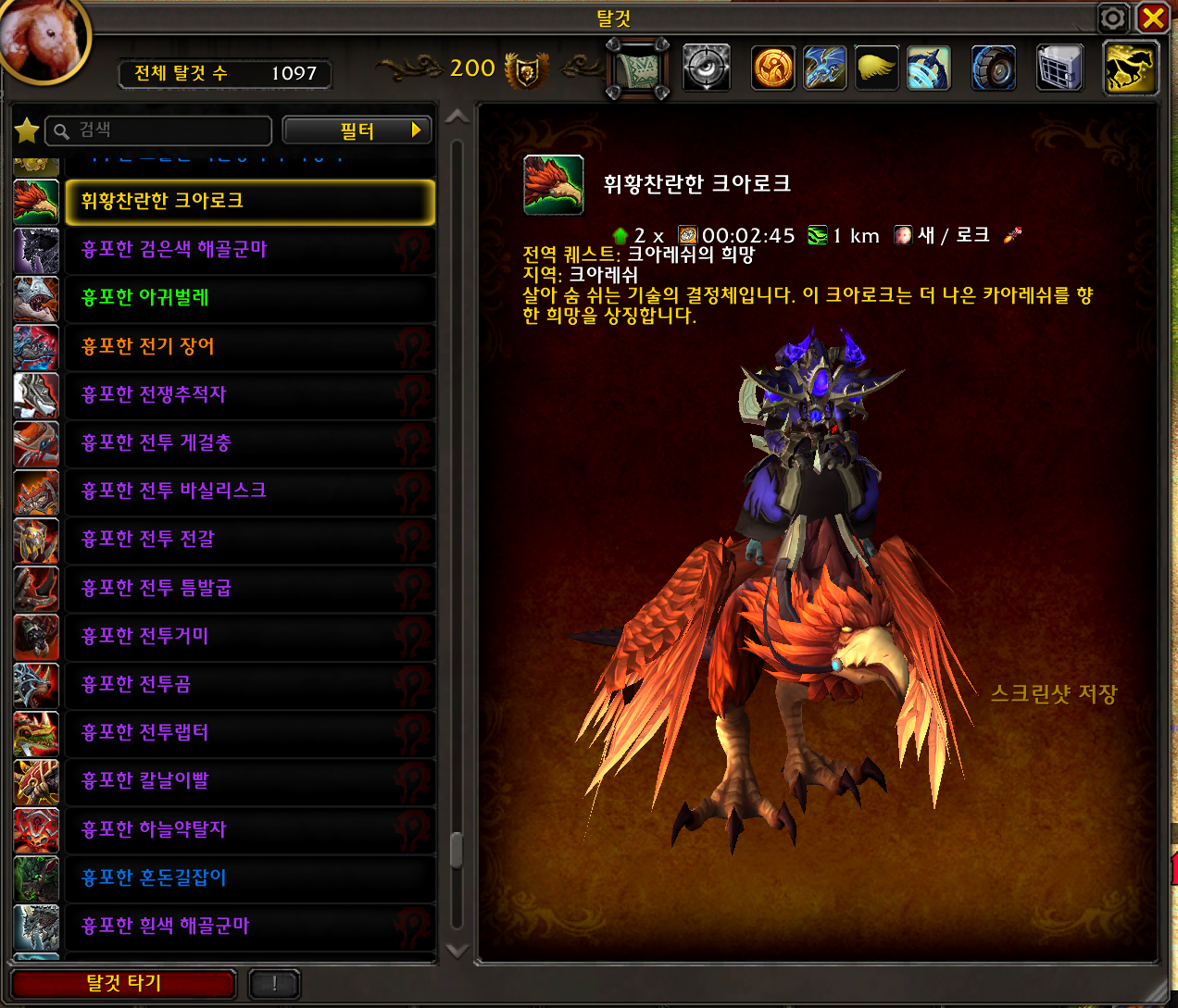 2025.09.12 휘황찬란한 크아로크 획득 1097번째 탈것