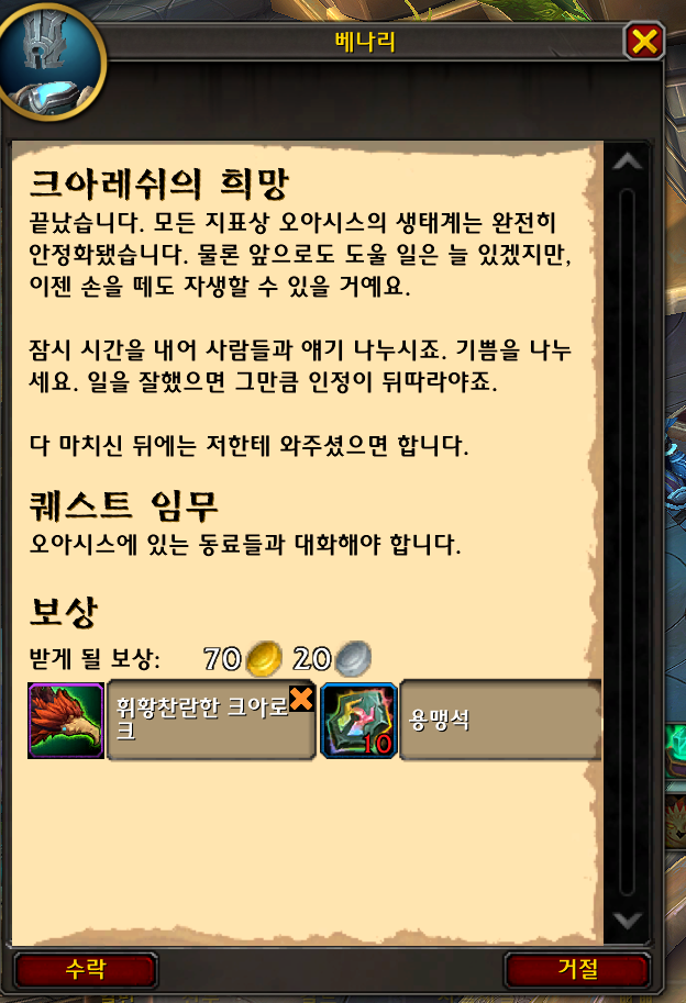 크아레쉬의 희망 퀘스트는 생물학적 안정성 / 생물학적 다양성 업적을 띄우면 오른편에 베나리가 퀘스트를 줍니다.