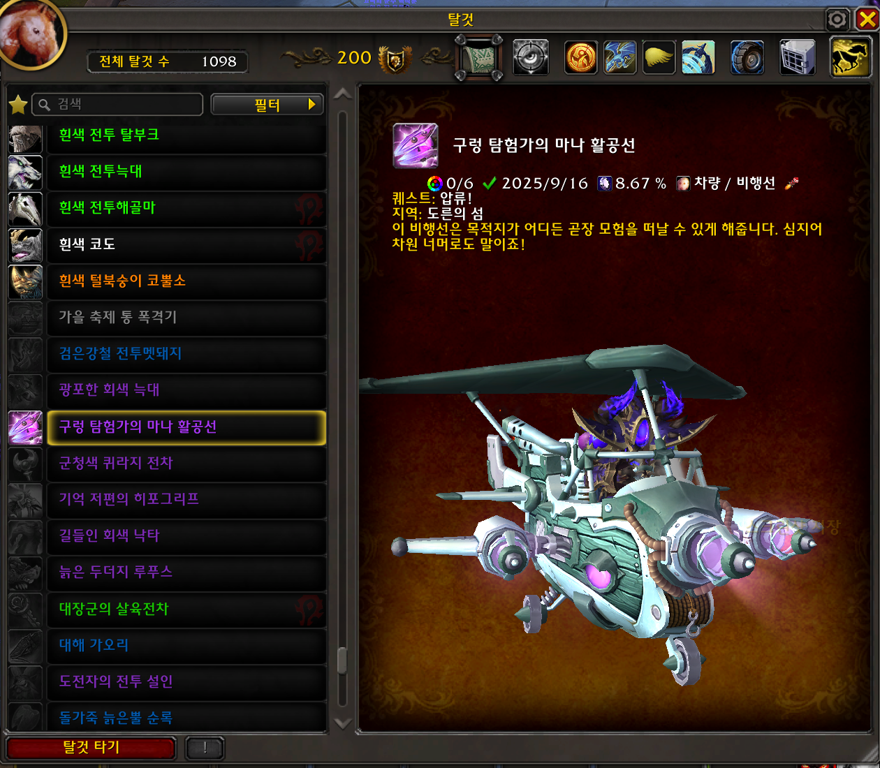 2025.09.16 구렁 탐험가의 마나 활공선 획득 1098번째 탈것