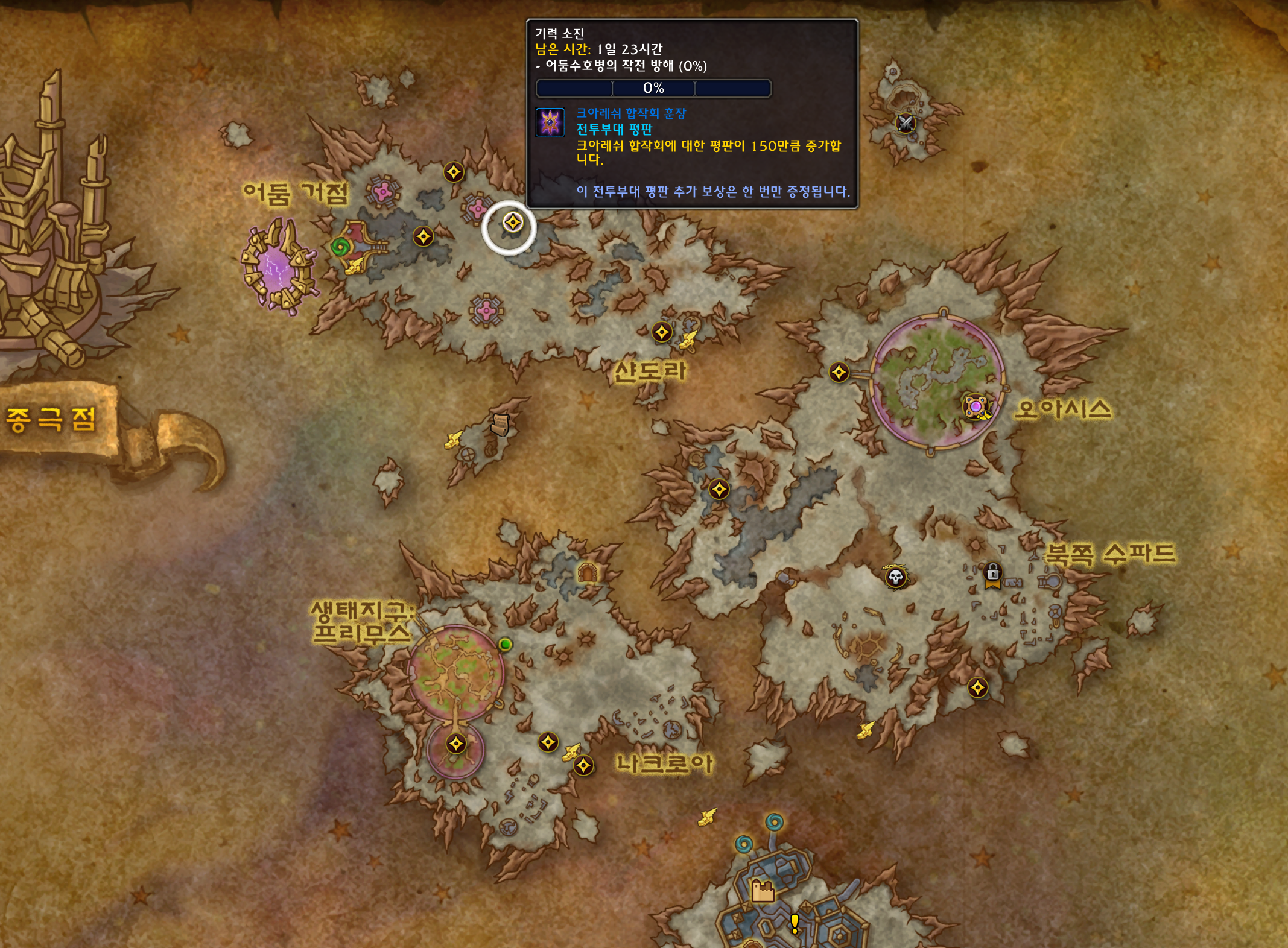 오아시스 지역에 있는 생태 천이 대장정을 완료하면 파란색 주간퀘들을 줍니다. 파란색 주간퀘가 크아레쉬 평판을 주기때문에 생태천이 대장정도 하면 좋습니다.