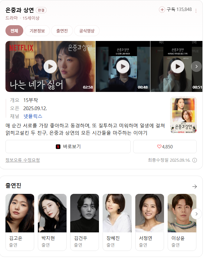 나는 캐스팅을 정말 잘했다고 생각한다. 너무 아름다운 배우를 쓰면 은중의 캐릭터에 맞지 않는 느낌을 받을수 있는데 김고은 배우가 딱 은중이 상연에게 느끼는 감정들을 정말 잘 연기하였다. 박지현 배우역시 정말 다시보았고 연기를 너무잘했다. 이게 대놓고 악역은 연기 하기쉽지만 나쁜역할인데 나빠보이지 않게하는건 쉬운게 아니라고 생각하는데 나쁜역할인데도 상연의 입장도 충분히 공감할수있게 했다고 나는 느꼈다. 아역들도 나오는데 심지어 아역들도 연기를 너무잘해서 어릴때 부분도 너무재미있었다.