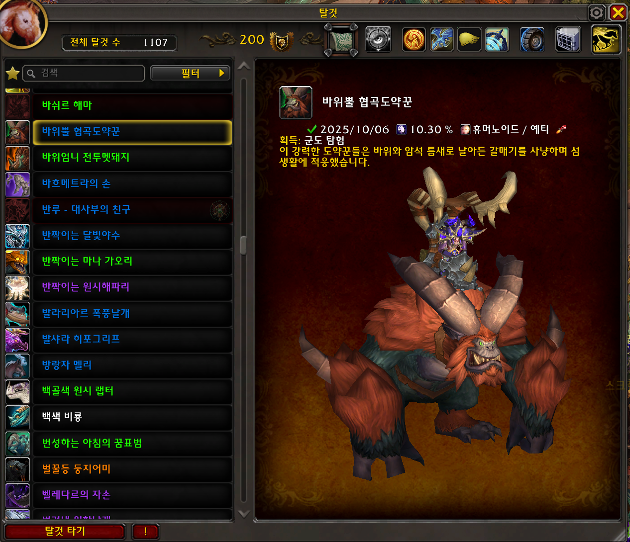 2025.10.06 바위뿔 협곡도약꾼 획득 1107번째 탈것