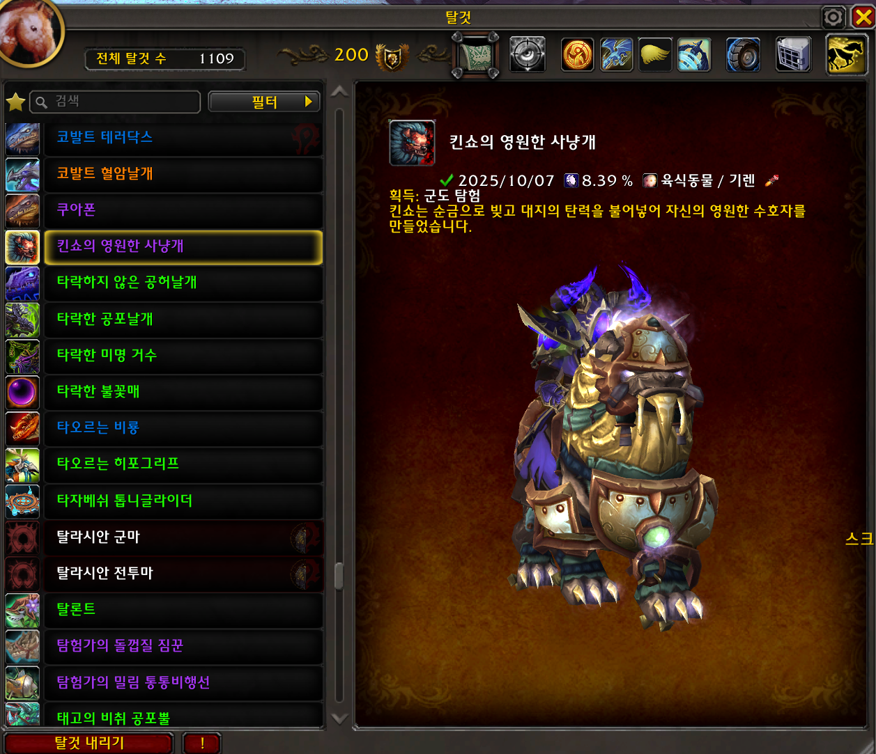 2025.10.07 킨쇼의 영원한 사냥개 획득 1109번째 탈것