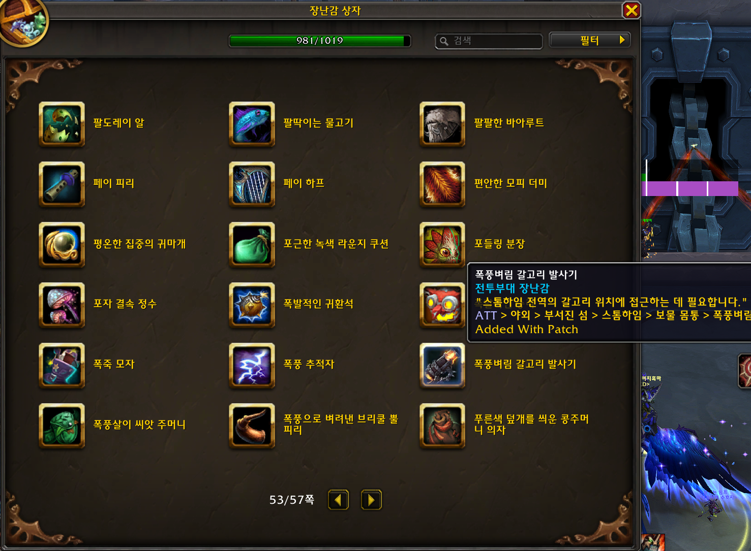 폭풍벼림 갈고리 발사기 장난감은 내부전쟁 확장팩 장난감으로 군단리믹스가 나오면서 추가된 장난감입니다.