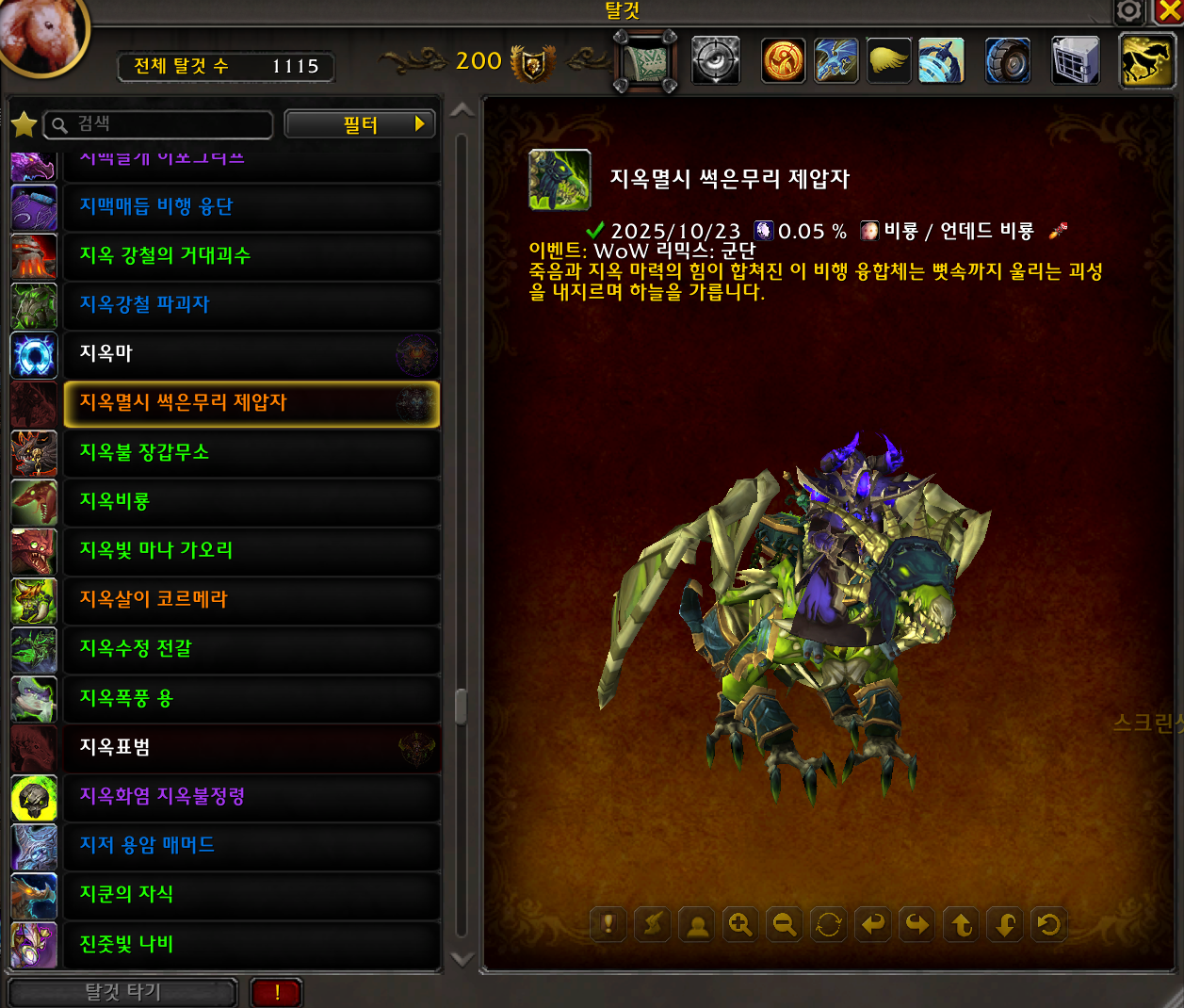 2025.10.23 지옥멸시 썩은무리 제압자 탈것 획득 1115번째 탈것