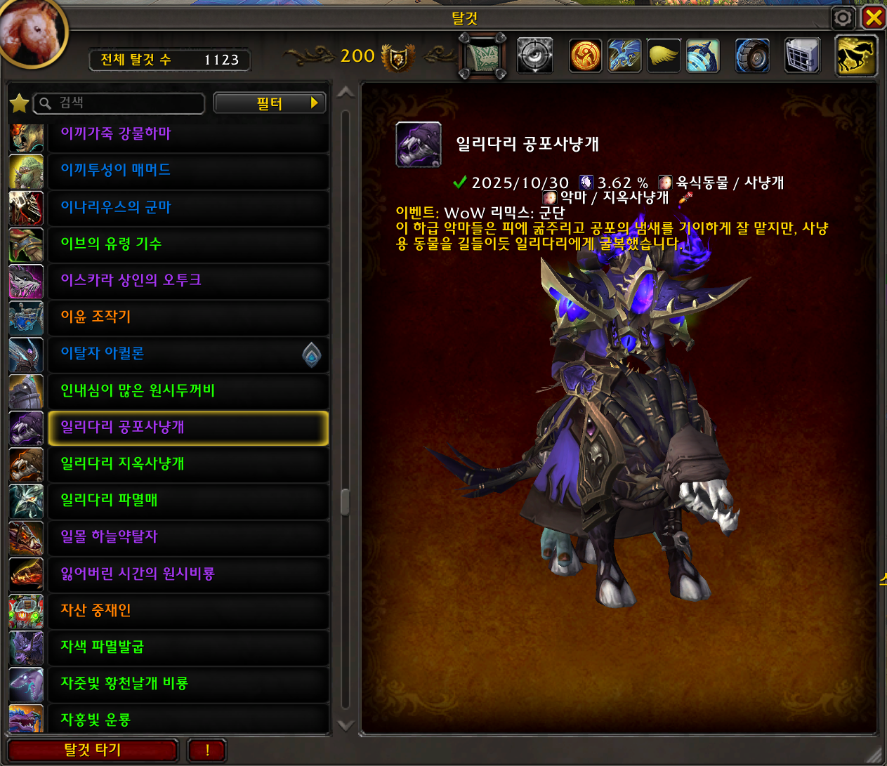 2025.10.30 일리다리 공포사냥개 획득 1123번째 탈것