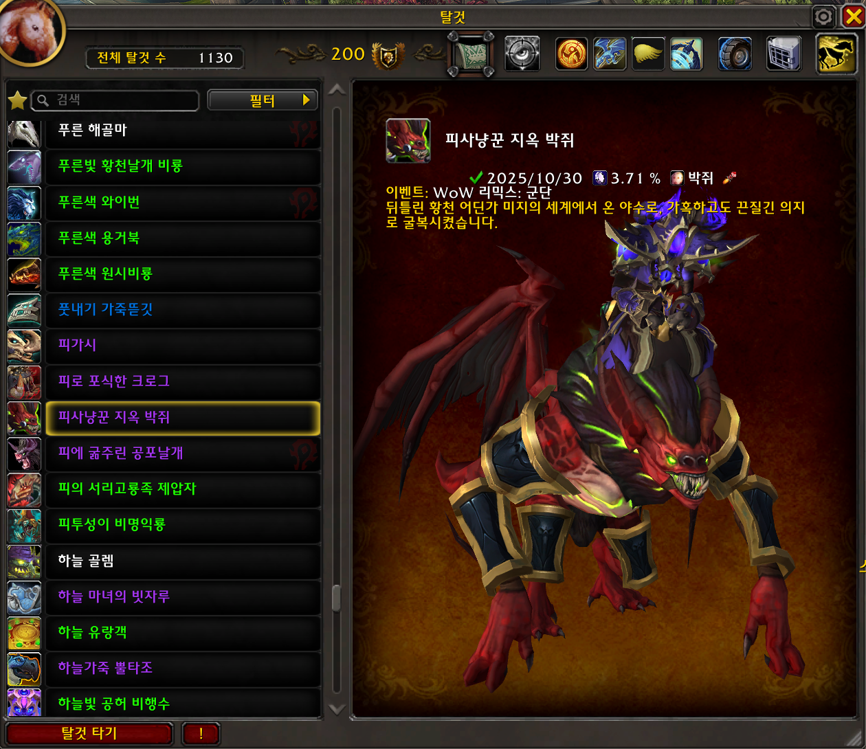 2025.10.30 피사냥꾼 지옥 박쥐 획득 1130번째 탈것