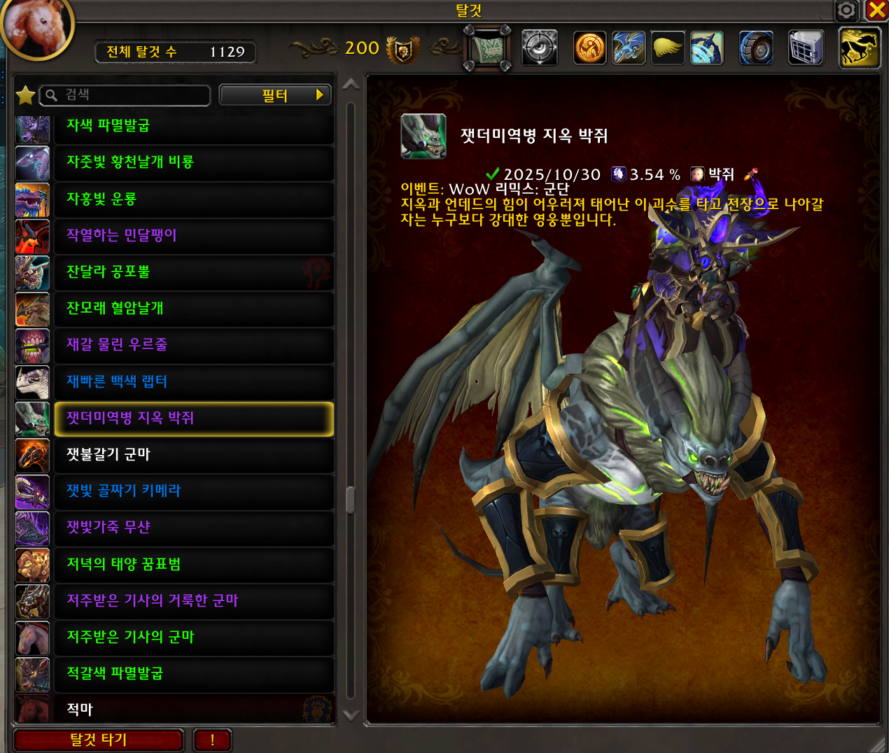 2025.10.30 잿더미역병 지옥 박쥐 획득 1129번째 탈것