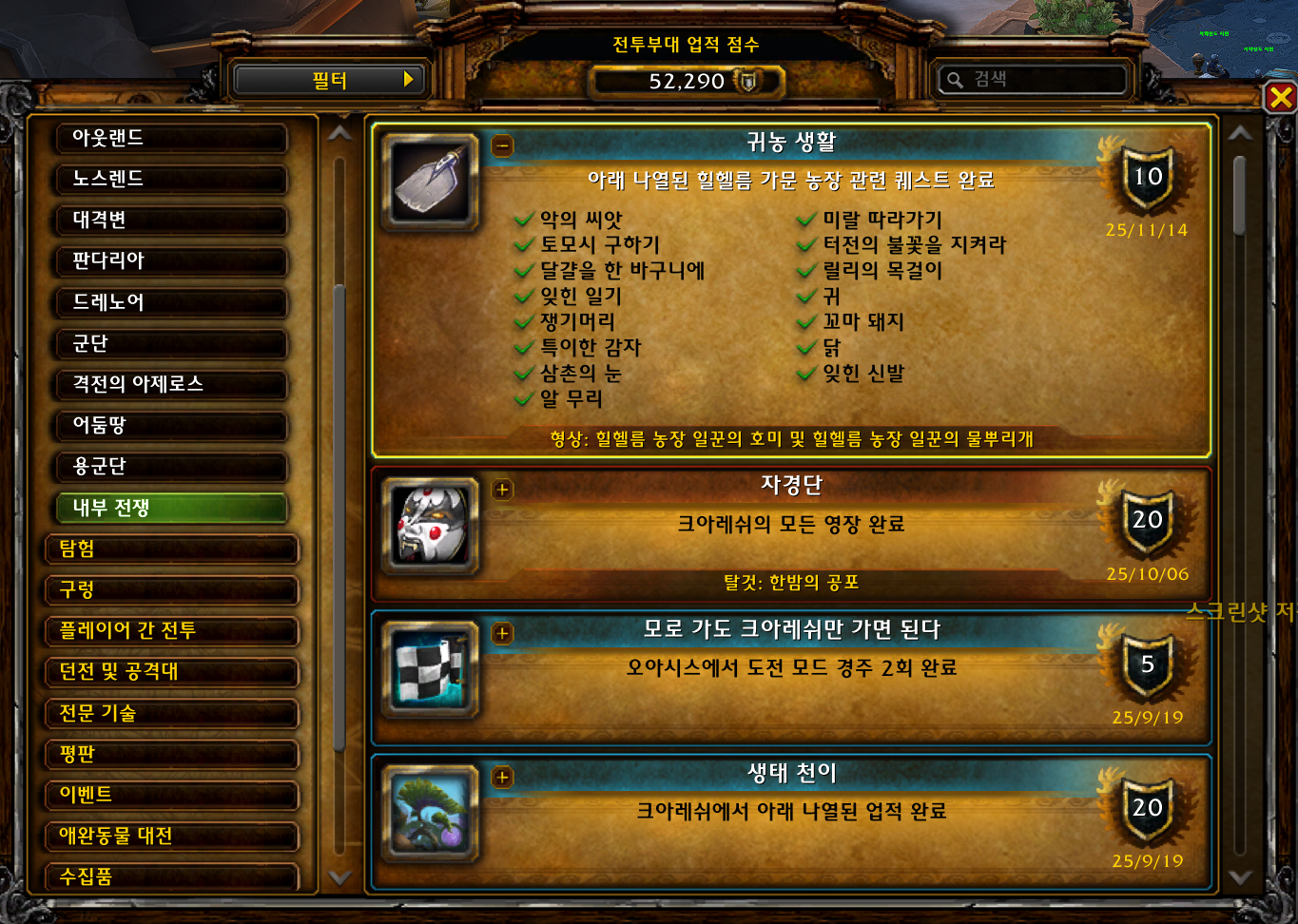 귀농 생활 업적은 내부전쟁 확장팩 업적으로 신성한협곡에서 하는 업적입니다.