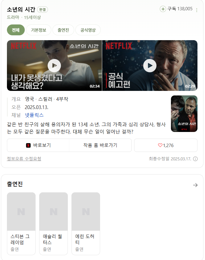 인셀이라는 인터넷문화가 있고 어린아이들이 컴퓨터 SNS등을 통해 잘못된 성문화등을 배우게 되었을때 이런일이 발생할수도 있다라는 그런건데 아니 그럴꺼면 인셀을 다루는 다큐멘터리를 보고말지 이런느낌이었다. 보는내내 너무 지루하였다. 혹시 나만 그런가하고 검색해보니 너무재미있다는 의견도있고 나처럼 지루하다는 의견도있었다. 근데 가장 이해가 안되는건 폭싹 속았수다가 1위였는데 소년의 시간이 나오고 같은시기에 1위를 밀렸다는게 난 정말 이해가 안되었다. 이게 어떻게 폭싹 속았수다를 이겼지....