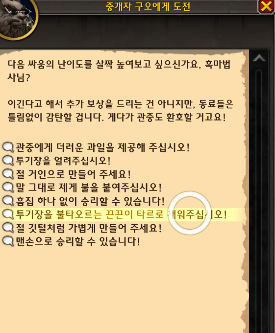 싸울가르 투기장 안에있는 중개자 구오에게 불타오르는 끈끈이 타르로 채워주십시오 말풍선을 선택하면 됩니다.