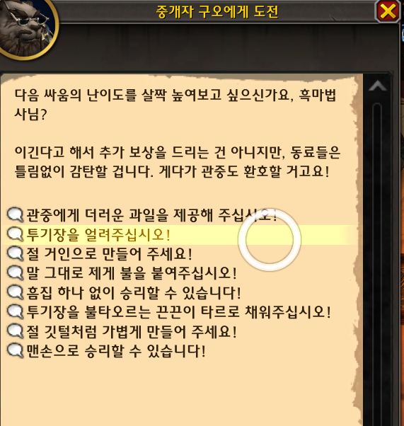 싸울가르 투기장 안에있는 중개자 구오에게 투기장을 얼려주십시오 말풍선을 선택하면 됩니다.