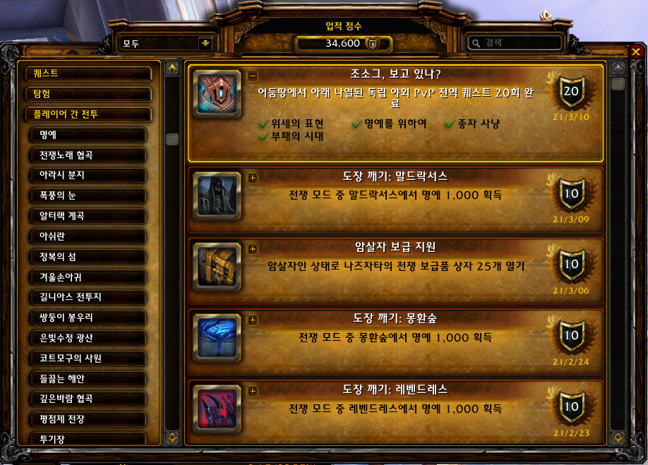 조소그, 보고 있나? 업적은 어둠땅 pvp전역퀘 4개를 각각 20회씩 완료하면 달성됩니다.