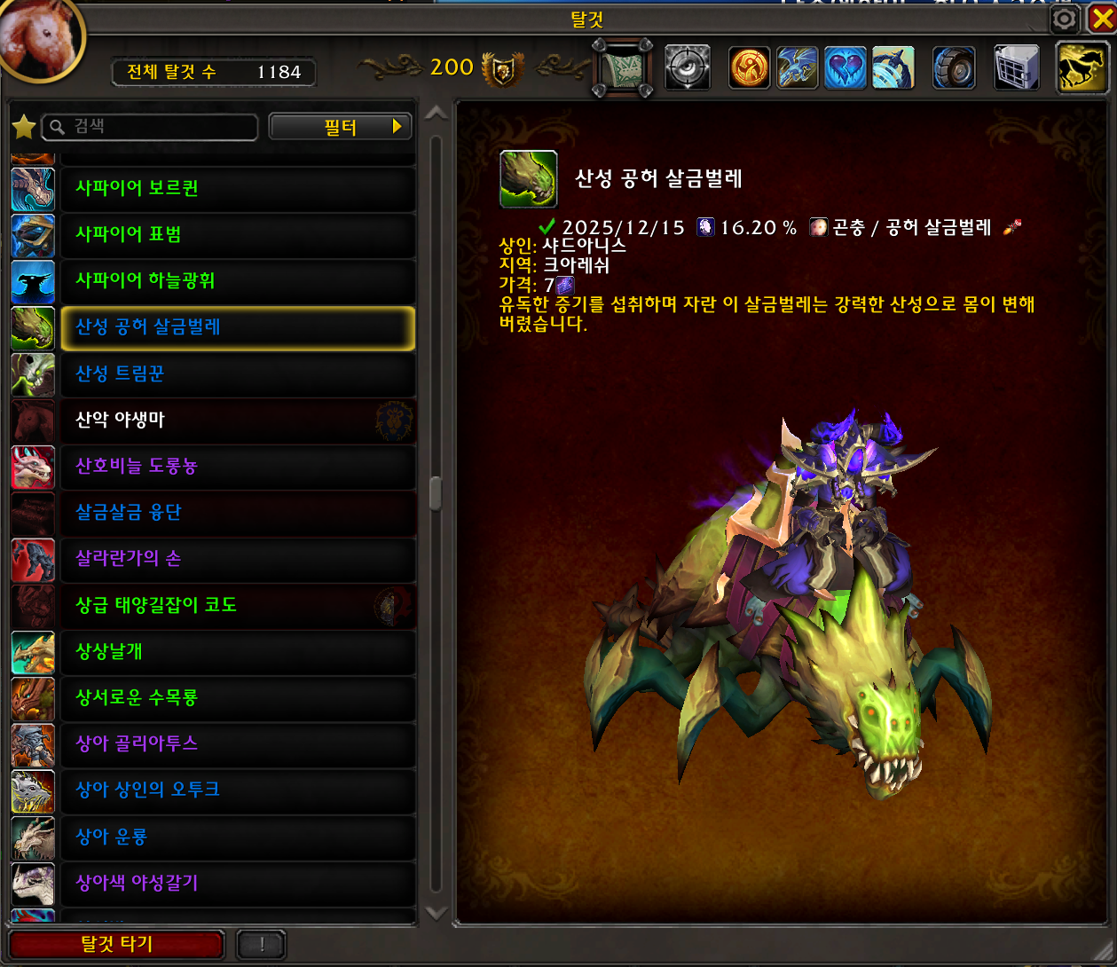 2025.12.15 산성 공허 살금벌레 획득 1184번째 탈것