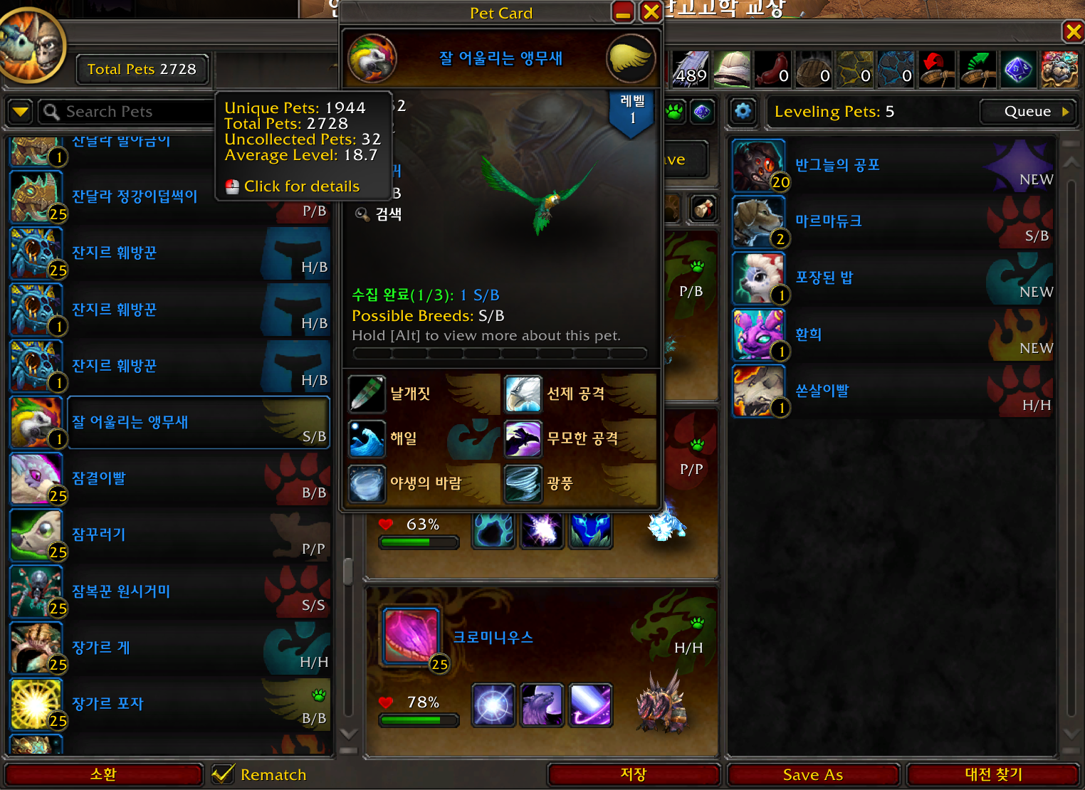 잘 어울리는 앵무새 애완동물은 내부전쟁 확장팩 애완동물로 세이렌의 섬에서 해적침공일때만 가능합니다.