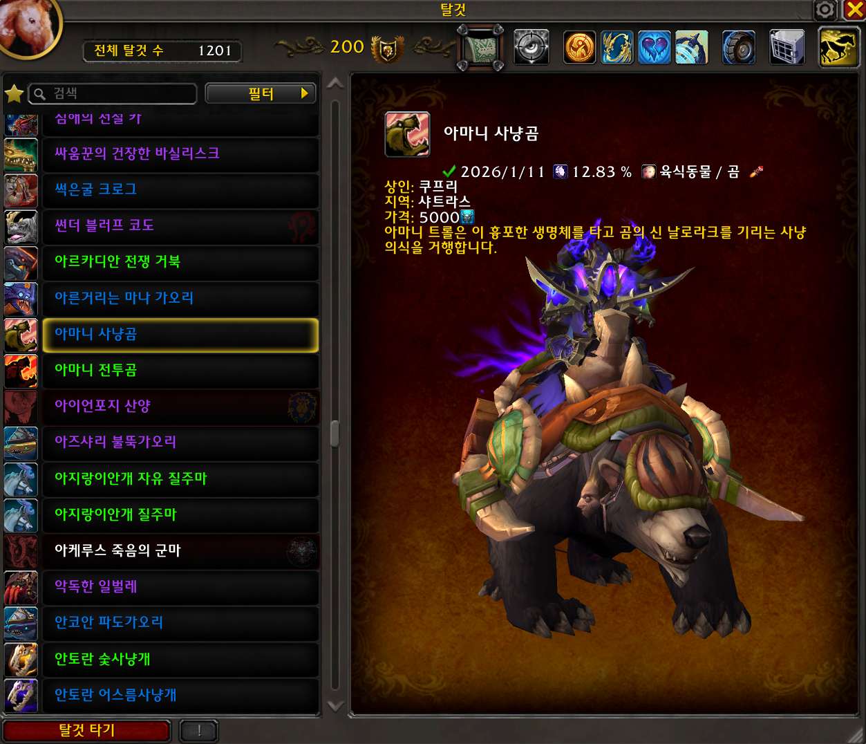 2026.01.11 아마니 사냥곰 획득 1201번째 탈것