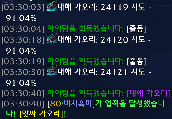 진짜 너무 힘들었습니다. 이게 짜증나는게 격아완전초반에 드랍률이 엄청높아서 금방할수있는 업적이었습니다. 근데 이때 격아완전초반이라 레이드파밍하고 다른업적하느라 낚시를 안했는데 드랍률이 완전 내려가는 패치가 있었습니다.