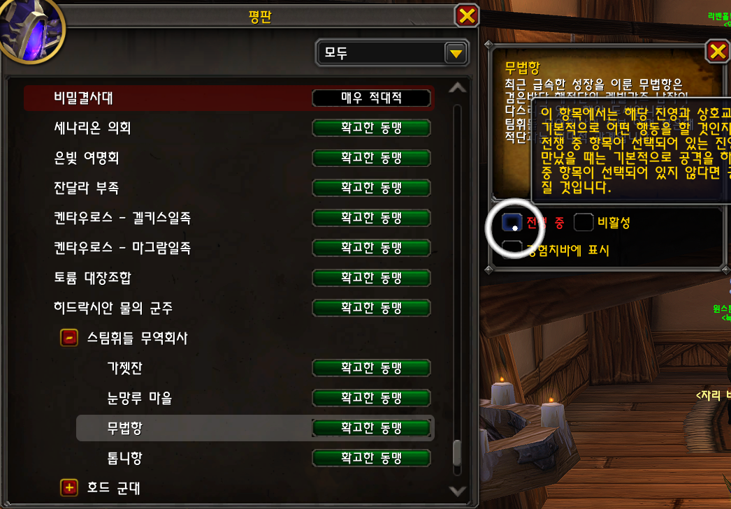 무법항 평판을 클릭하면 전쟁 중 이라는 체크박스가 있습니다. 이것을 체크하고