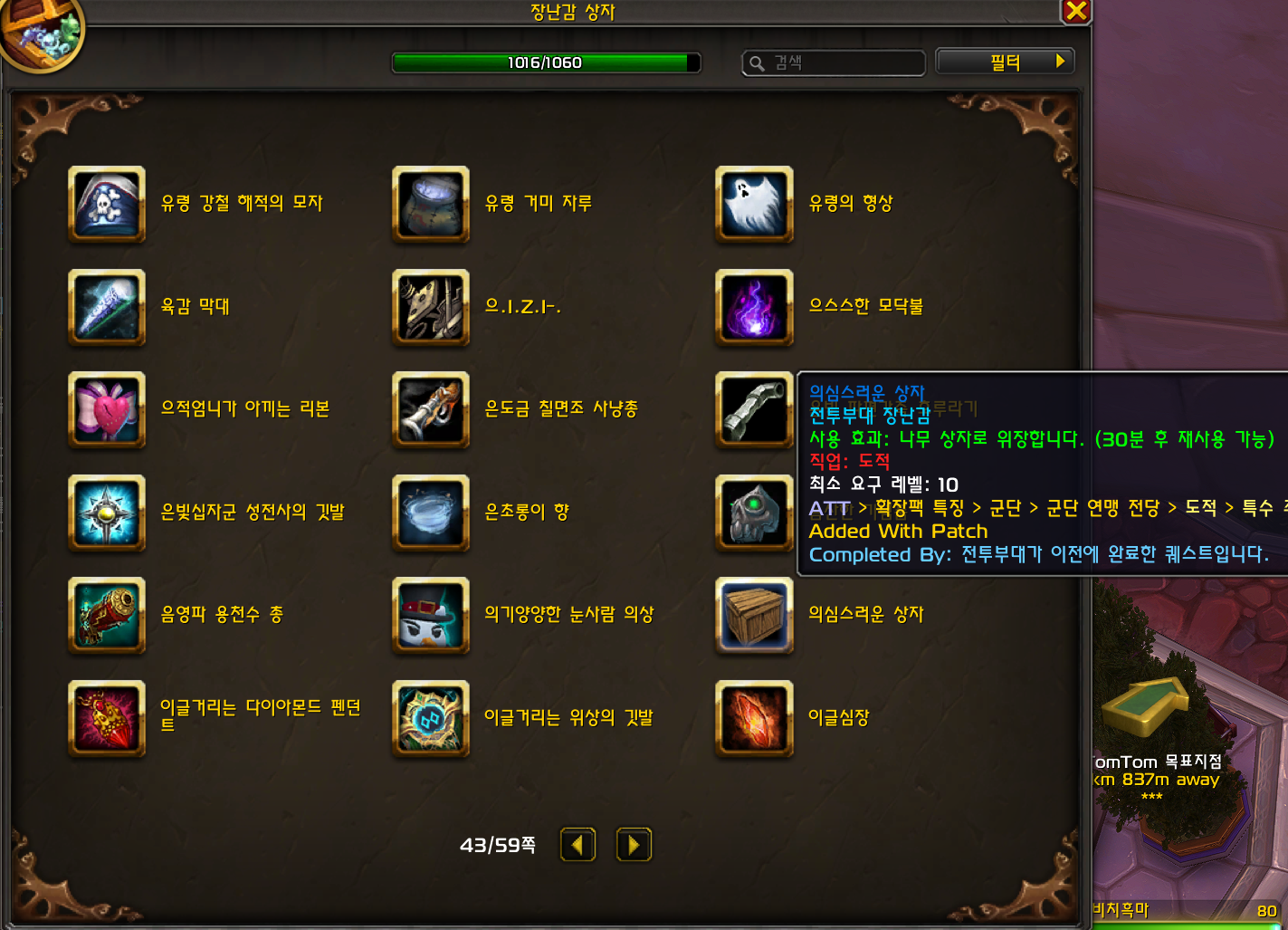 의심스러운 상자 장난감은 군단 확장팩 장난감으로 도적만 획득가능한 장난감입니다.