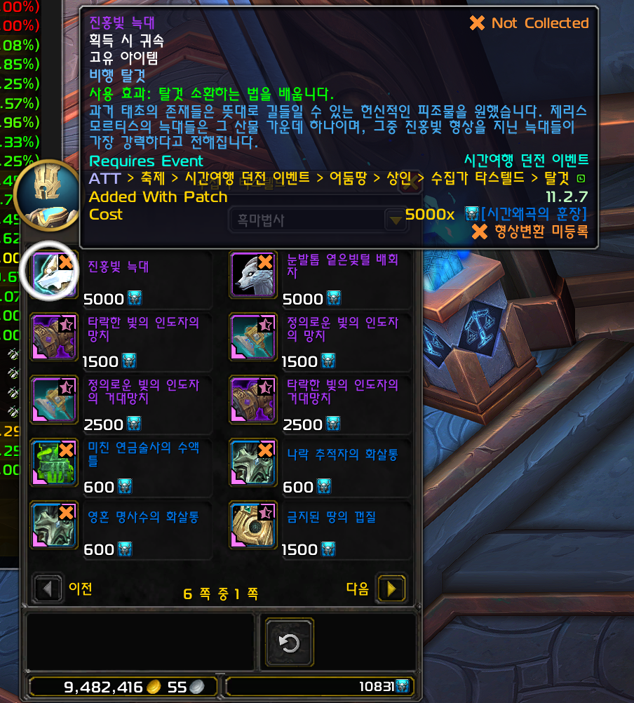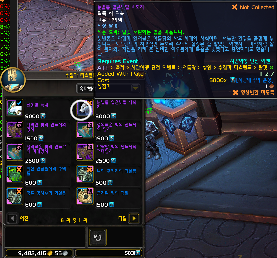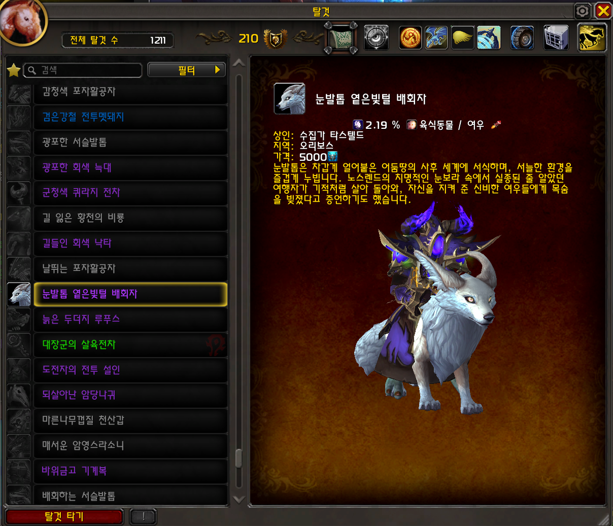 진홍빛 늑대 / 눈발톱 옅은빛털 배회자 탈것은 내부전쟁 확장팩에 추가된 탈것으로 어둠땅시던일때만 구매가능합니다.