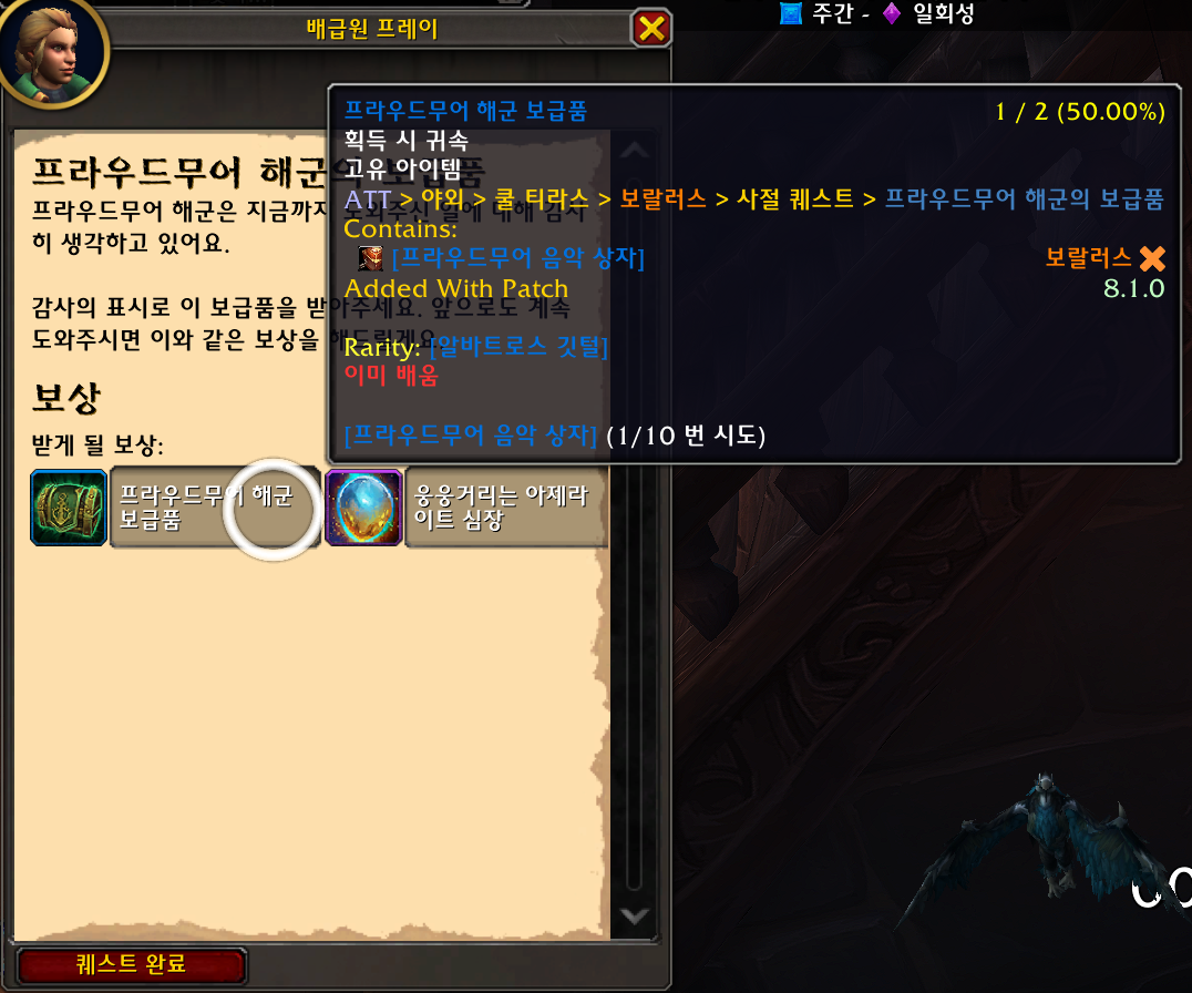 수수께끼 운세의 바람중에 평판을 50%더줘서 매일 프라우드무어 해군 전역퀘를 완료했고 오늘 드디어 나왔네요.