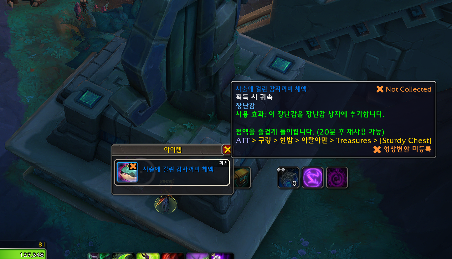 2026.03.04 아탈아만에서의 발견 획득 5점짜리 53975점 아탈아만에서 튼튼한 상자3개를 여는 업적입니다. 위치는 아래와 같습니다. 1번 2번 3번위에서 떨어져야함