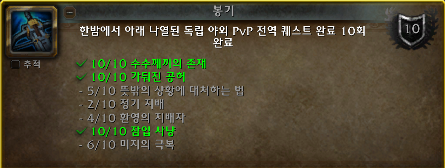 전부다 10번씩 하는업적이 있습니다. 본캐로해도 부캐로 또해도됩니다. 계정공유라서 본캐 부캐 하는것들이 전부 집계됩니다.