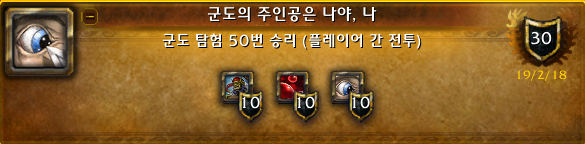 군도의 주인공은 나야, 나 업적은 군도 pvp를 50회 승리하면 됩니다. 다만 문제는 같은진영끼리는 매칭이 안됩니다. 즉 호드3명 vs 얼라3명 이런식으로 매칭이 됩니다. 따라서 본인이 호드로 3인파티로 신청했으면 얼라쪽도 3인파티로 신청을해야 매칭이 됩니다.
