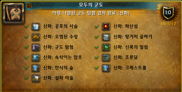 2021.03.18 이야기를 들려주오 획득 10점짜리 34675점 이야기를 들려주오 업적은 격전의 아제로스 군도탐험에서 20개의 퀘스트를 전부 완료하면 획득 가능합니다. 그런데 해당퀘스트들은 아무때나