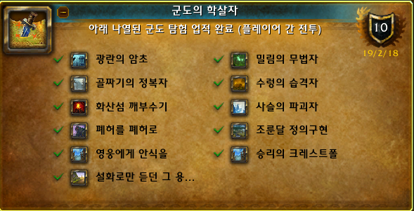 군도의 학살자 업적은 11개의 군도탐험 맵을 일반 영웅 신화가 아닌 pvp난이도로 승리하여서 클리어하면 획득 가능합니다.