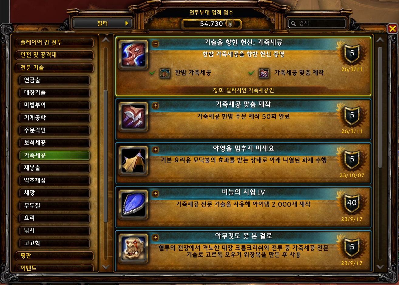 2026.03.11 한밤 가죽세공 획득 10점짜리 54720점 한밤 가죽세공 업적은 한밤 확장팩업적으로 가죽세공 숙련도 100을 찍는업적입니다. 이글은 오로지 숙련도 100을찍는 업적을 위한것이지 골드를벌기