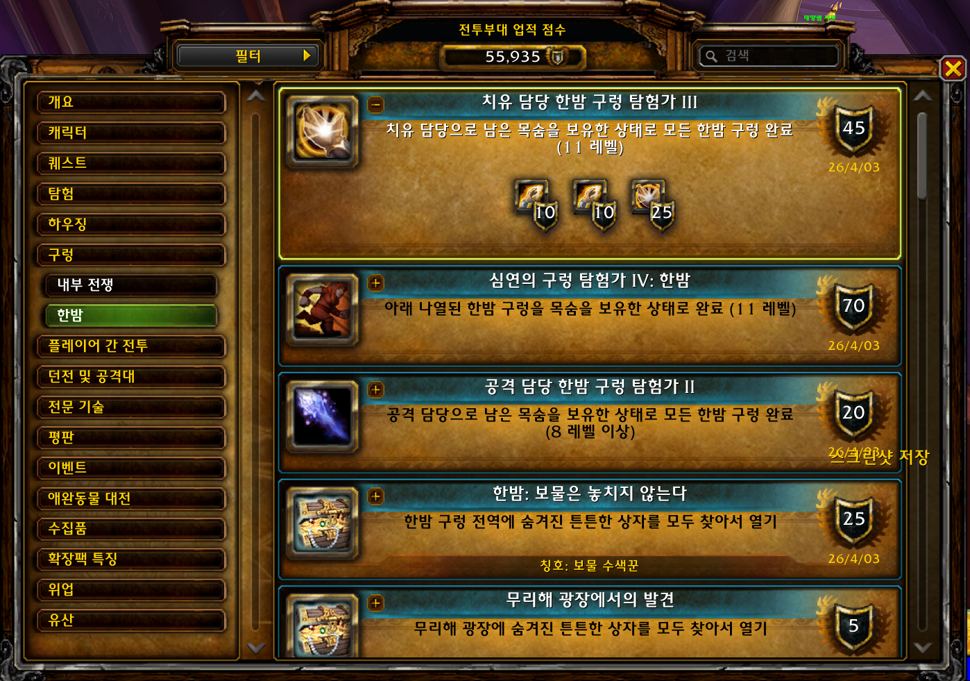 2026.04.03 치유 담당 한밤 구렁 탐험가 III 획득 25점짜리 55935점