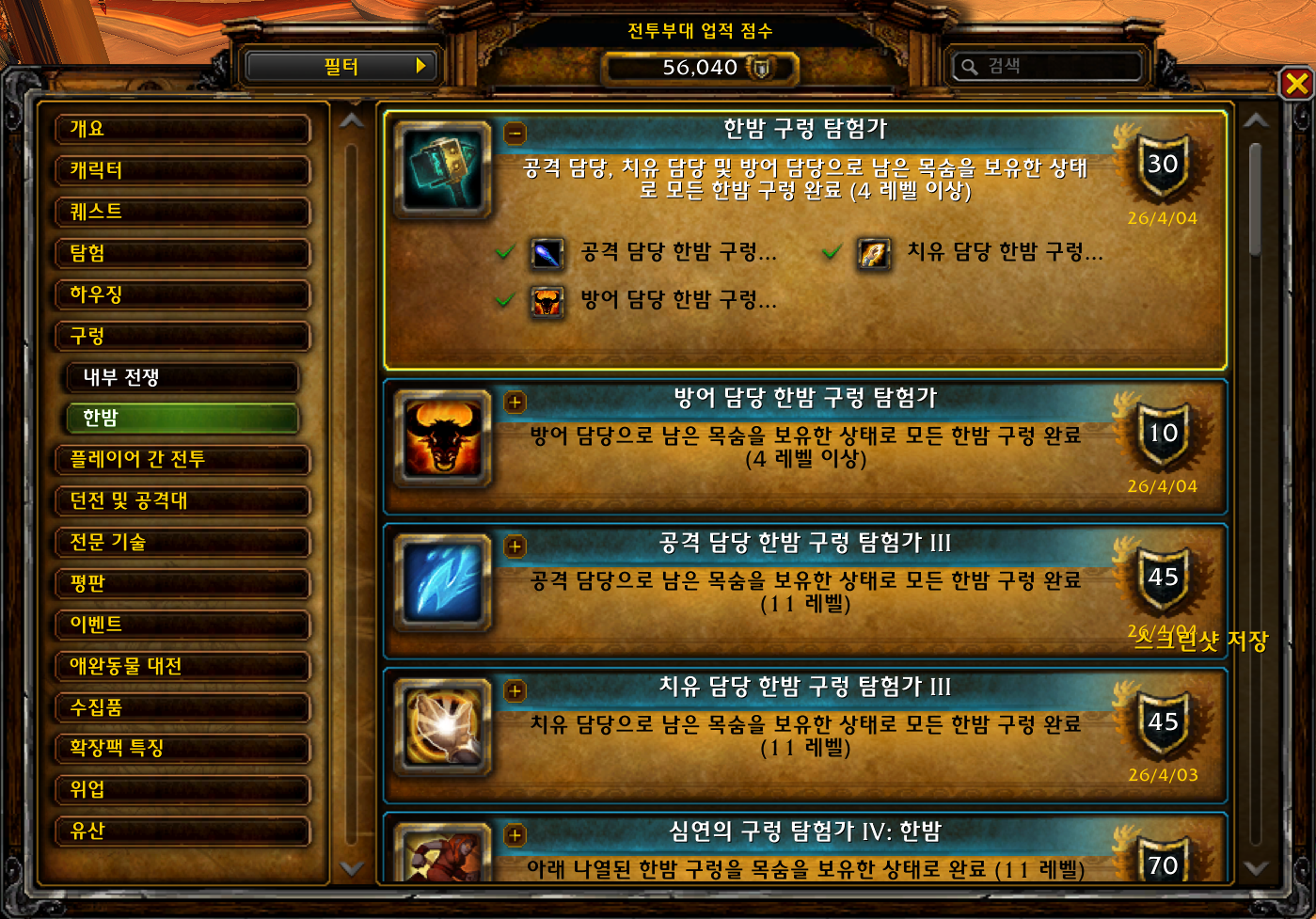 2026.04.04 한밤 구렁 탐험가 획득 30점짜리 56040점