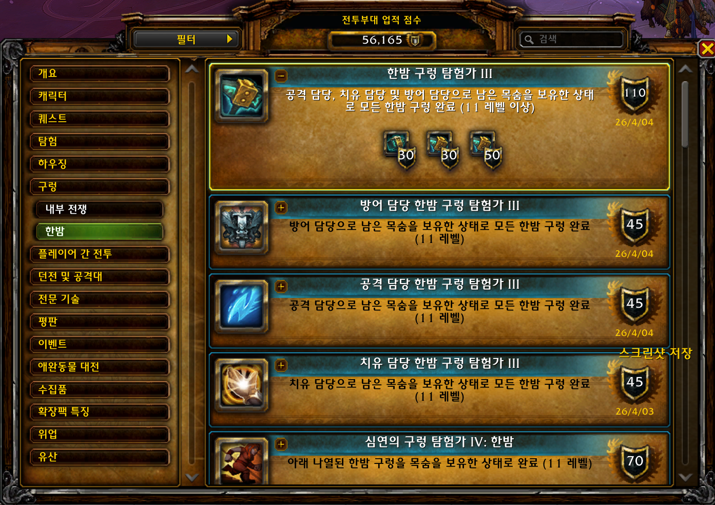 한밤 구렁 탐험가 업적은 한밤 확장팩 업적으로 구렁 11랩으로 10개던전을 탱 딜 힐 전부 클리어 하면 됩니다.