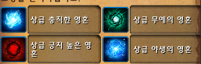 상급 충직한 영혼 / 상급 무예의 영혼 / 상급 긍지 높은 영혼 / 상급 야생의 영혼 총 4개입니다.