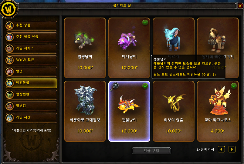 잿불냥이는 블리자드샵에서 10000원에 판매하는 애완동물입니다. 7월12일까지 여름할인으로 반값이어서 어제 구매하였습니다. 만약에 블리자드샵에서 탈것과 애완동물을 구매할 계획이시라면 곡 여름할인이나 겨울할인을 이용해서 구매하시는것을 추천합니다.