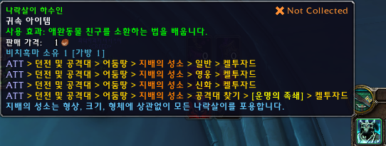 나락살이 하수인은 9.1에 추가된 애완동물로 지배의 성소 레이드 9넴인 켈투자드를 잡으면 일정확률로 획득 가능합니다.