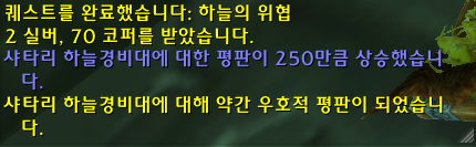 하늘의 위협퀘스트를 완료하시면 샤타리 하늘경비대 평판이 오르시는것을 확인할수 있습니다.