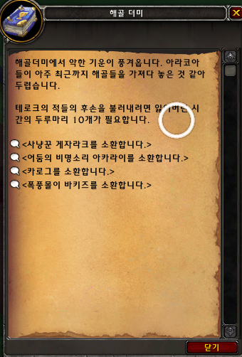 잃어버린 시간의 두루마리가 10개 있는 상태에서 해골 더미를 클릭하면 다음과 같은 창이뜨고 원하는 몹 1마리를 소환할수 있습니다. 해당몹을 잡으면 100좀넘는 평판을 주기때문에 같이 하시면 됩니다.