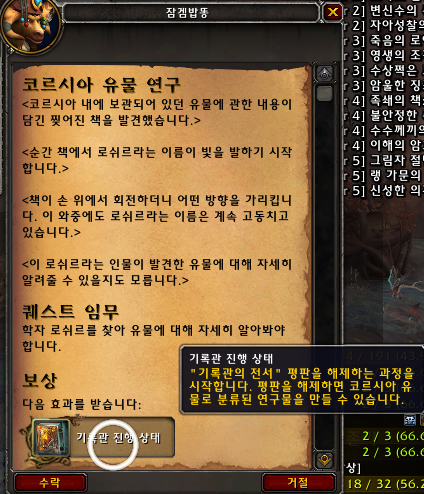 먼저 기록관 평판을 해금하기 위해서는 코르시아 유물 연구라는 퀘스트 라인을 진행해야 합니다. 해당퀘는 계정공유가 아니기 때문에 본캐부캐 다하여야 합니다.