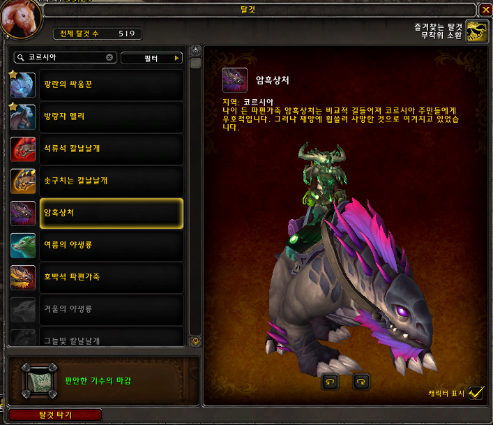 암흑상처를 먹으면서 이제 코르시아 탈것이 7개 / 14개로 딱 절반먹었네요