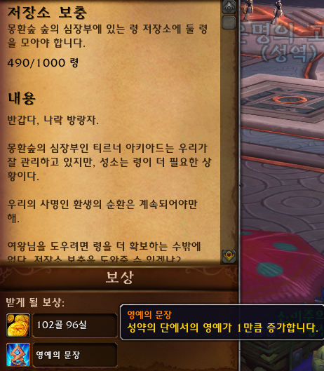 첫번째 퀘스트는 저장소 보충이라는 퀘스트입니다. 령을 1000개 모으는 퀘스트입니다.