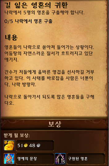 두번째 퀘스트는 길 잃은 영혼의 귀환이라는 퀘스트입니다. 나락에가서 영혼 5마리를 구출하는 퀘스트 입니다.