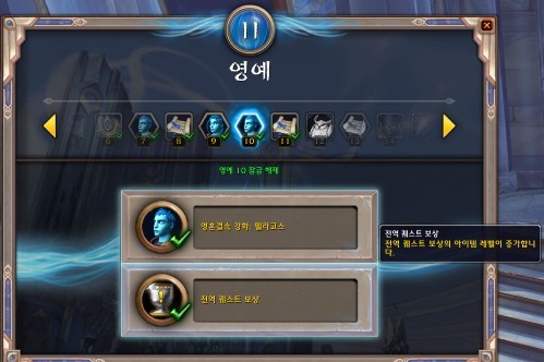 본인의 영예가 9였다고 가정합시다. 그러면 퀘스트 2개를 완료해서 11을만들고 성약단 대장정을 해서 영예를 11에서 12로 올리는것입니다.
