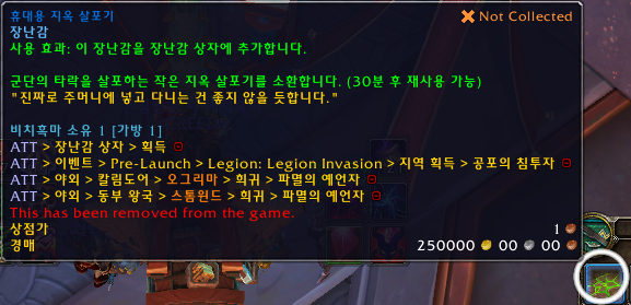 휴대용 지옥 살포기 장난감은 더이상 획득 할수 없는 장난감입니다. 소군단에만 얻을수 있는 장난감입니다. 저는 소군단때 안했기 때문에 해당 장난감이 없었는데