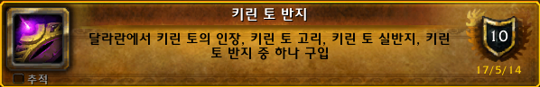 해당업적은 리치왕의 분노 달라란(구달라란)에서 키린 토의 인장, 키린 토 고리, 키린 토 실반지, 키린 토 반지