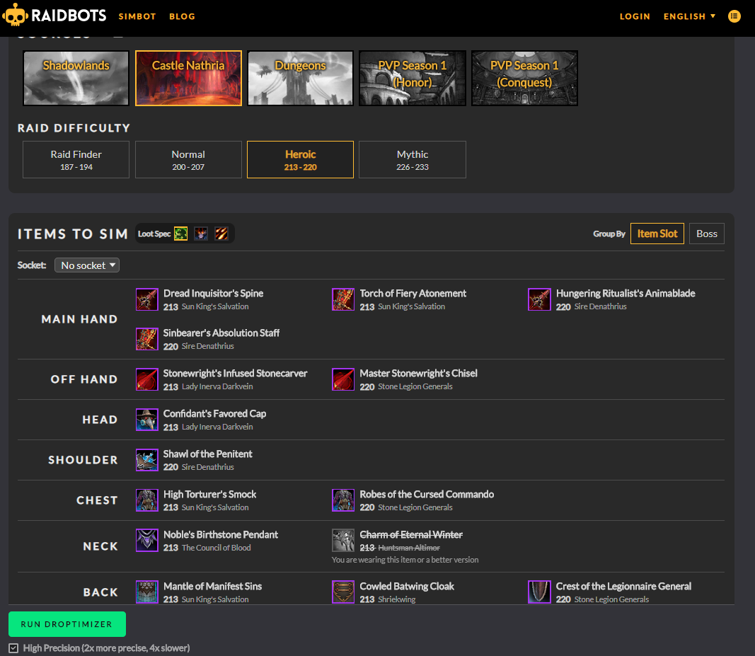 DROPTIMIZER - 현재확장팩 던전/레이드 에서 무슨템을 먹으면 현재보다 강해지는지 알수있는 기능입니다.
